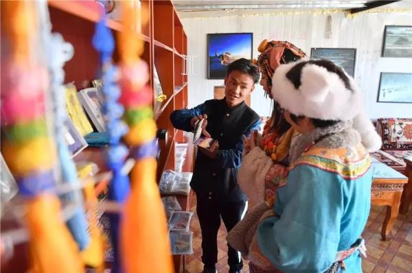 西藏自治區(qū)納木錯(cuò)自然保護(hù)區(qū)郵局,旦增洛珠(左)正在給游客介紹旅游產(chǎn)品。自農(nóng)村電商工作開展以來,西藏郵政已在全區(qū)各地(市)多個(gè)郵政營業(yè)網(wǎng)點(diǎn)、便民服務(wù)站、小商超店、旅游景點(diǎn)等地建立“郵掌柜”、郵樂購、郵樂網(wǎng)、天上西藏E郵等網(wǎng)上購物和銷售系統(tǒng)。