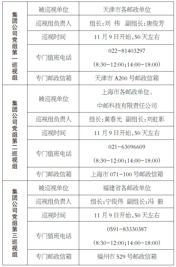 根據(jù)安排,黨組首批巡視的3個(gè)巡視組將開展為期50天左右的巡視,時(shí)間從目前到12月底。通過發(fā)布巡視公告,設(shè)專門值班電話、專門郵政信箱等,受理反映被巡視單位領(lǐng)導(dǎo)班子及其成員、下一級黨組織領(lǐng)導(dǎo)班子主要負(fù)責(zé)人和重要崗位領(lǐng)導(dǎo)干部問題的來信來電來訪,重點(diǎn)是關(guān)于違反政治紀(jì)律、組織紀(jì)律、廉潔紀(jì)律、群眾紀(jì)律、工作紀(jì)律和生活紀(jì)律等方面的舉報(bào)和反映。同時(shí),集團(tuán)公司監(jiān)察局(郵編:100808)也將在巡視期間受理反映上述問題的來信。□郵紀(jì)監(jiān)
