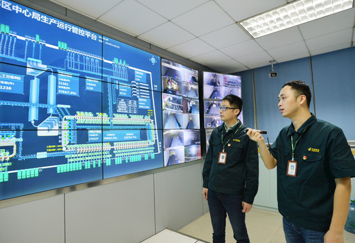 汪磊(右)與團隊成員一起了解生產(chǎn)管控平臺運行情況。