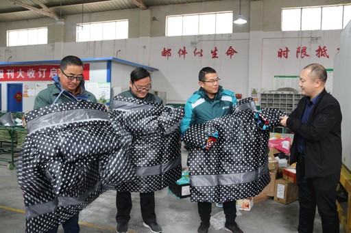 “這擋風(fēng)被真厚實(shí)?!?1月17日,河南省衛(wèi)輝市郵政分公司“三合一”郵件處理場地的投遞員們拿著新發(fā)放的棉帽子、棉手套、電動(dòng)車擋風(fēng)被等御寒保暖勞保用品感慨道。□劉艷玲 攝