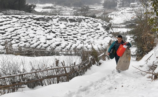連日來,地處大別山區(qū)的安徽省六安市金寨縣普降暴雪,通村山路被冰雪覆蓋,車輛難以通行。金寨縣張沖鄉(xiāng)郵政所的投遞員谷明洲改用肩挑手提郵件,步行數(shù)十里山路,及時為群眾投送郵件。圖為金寨縣張沖鄉(xiāng)郵政所投遞員谷明洲踏著被冰雪覆蓋的山路為群眾送郵件。