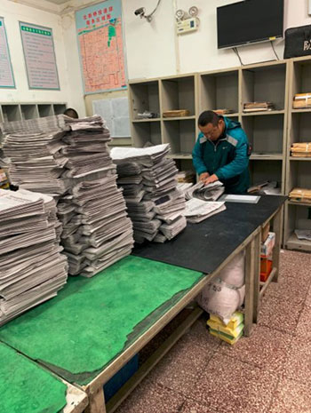 東四郵局北新橋投遞部已經(jīng)分好的報紙(央廣記者 馮會玲攝)