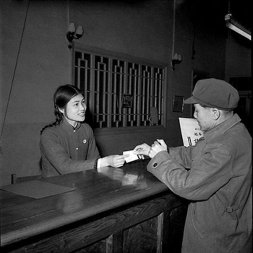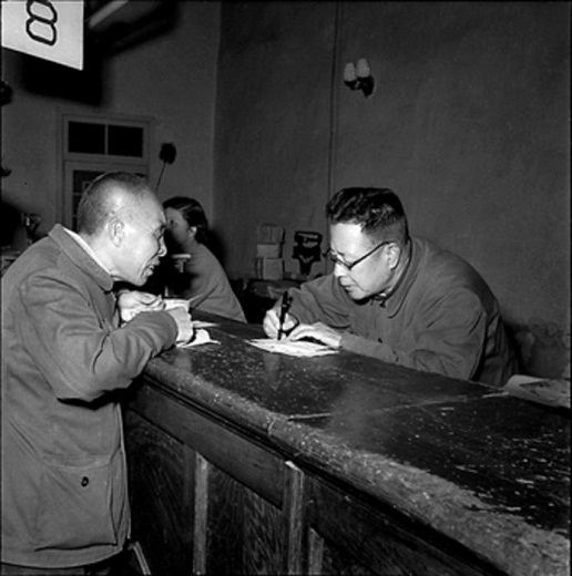 1958年4月,北京東四郵電局,在郵局工作了30多年的于鴻澤(圖右)積極為顧客填寫(xiě)單據(jù)。工人日?qǐng)?bào) 杜治 攝
