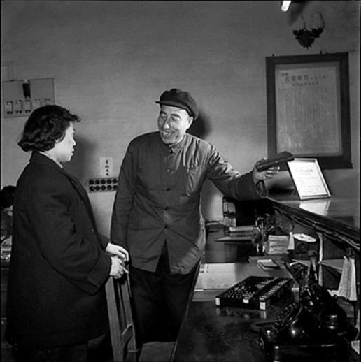 1958年4月,北京市郵局東城區(qū)局長(zhǎng)兼黨總支書(shū)記劉桂馨(右),在東四郵電局指導(dǎo)營(yíng)業(yè)員工作。工人日?qǐng)?bào) 杜治 攝