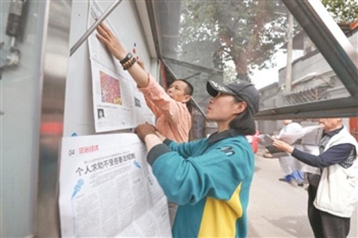 5月8日,劉小梅幫助社區(qū)志愿者在第一時(shí)間更換閱報(bào)欄的報(bào)紙。