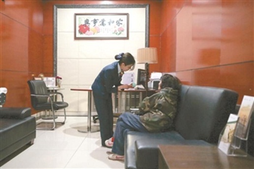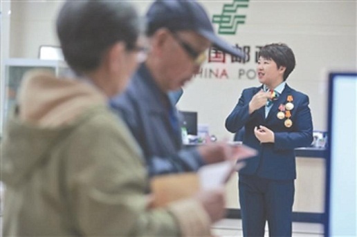 在自動(dòng)存取款機(jī)前,排了十多位老人,樊潔先讓在后面排隊(duì)的老人到休息區(qū)的椅子上休息一下,再一個(gè)個(gè)幫助存取錢的老人辦理業(yè)務(wù)。有的老人聽(tīng)不大清楚,她就湊近耳朵不厭其煩地一字一句地告訴他們,當(dāng)天上午,樊潔在自動(dòng)存取款機(jī)前站著忙活了兩個(gè)多小時(shí)?!皩?duì)我們營(yíng)業(yè)廳的工作人員來(lái)說(shuō),要求來(lái)有迎聲,問(wèn)有答聲,走有送聲,唱收唱付聲。只要用情用心服務(wù),就沒(méi)有辦不成的事?!彼f(shuō)這是東四郵局的傳統(tǒng)。