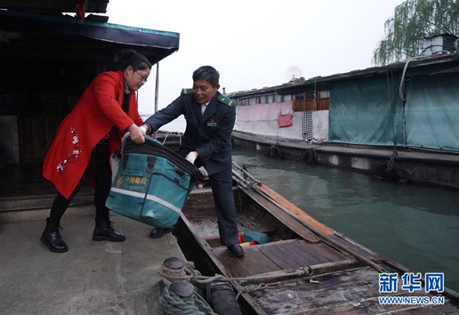 3月30日,唐真亞帶著郵包來到碼頭,準備出發(fā)送郵件。 新華社記者 季春鵬 攝