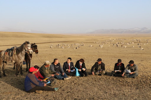 郵儲銀行工作人員在巴音布魯克草原上做業(yè)務(wù)宣傳。