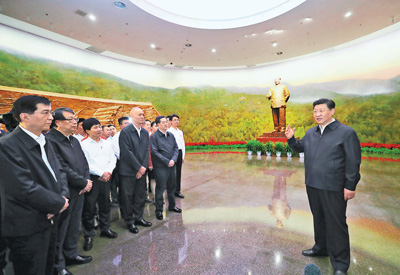 離開來青軒,習(xí)近平來到香山腳下的香山革命紀(jì)念館,參觀了《為新中國奠基——中共中央在北京香山》主題展覽。新建成的紀(jì)念館莊重大氣,“四梁八柱”的雨棚造型寓意黨中央在香山為新中國搭建四梁八柱。28根廊柱,象征中國共產(chǎn)黨從建黨到建立新中國28年的奮斗歷程。南廣場(chǎng)上矗立著高19.49米的國旗桿,寓意中華人民共和國誕生于1949年。主題展覽由“進(jìn)京‘趕考’”、“進(jìn)駐香山”、“繼續(xù)指揮解放全中國”、“新中國籌建”、“不忘初心、牢記使命、永遠(yuǎn)奮斗”5個(gè)部分組成,按歷史脈絡(luò),通過800多張圖片、報(bào)照、地圖、表格和1200多件實(shí)物、文獻(xiàn)和檔案,全景式生動(dòng)呈現(xiàn)中共中央在香山期間領(lǐng)導(dǎo)全國各族人民,完成民族獨(dú)立和人民解放的歷史使命、開啟中國歷史發(fā)展新紀(jì)元的光輝歷程。