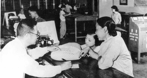 1958年,東四郵局沖破思想的藩籬,在全行業(yè)率先做到“從臺后到臺前”,為用戶提供服務。圖為東四郵局老“郵務佐”于洪澤(左一),主動轉變思想,帶領大家走出柜臺為用戶填寫單據(jù)。 (資料圖片)