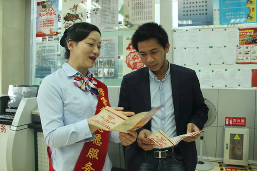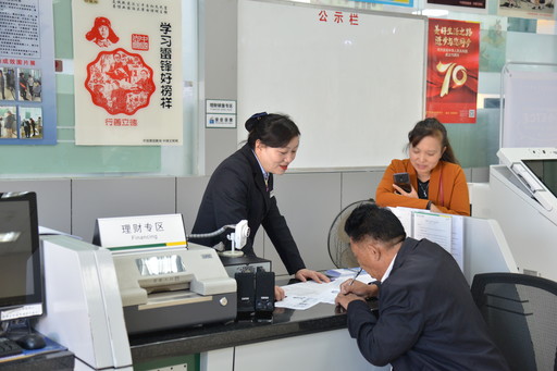 顧朝竹悉心為客戶辦理財(cái)產(chǎn)品購(gòu)買(mǎi)登記手續(xù)。