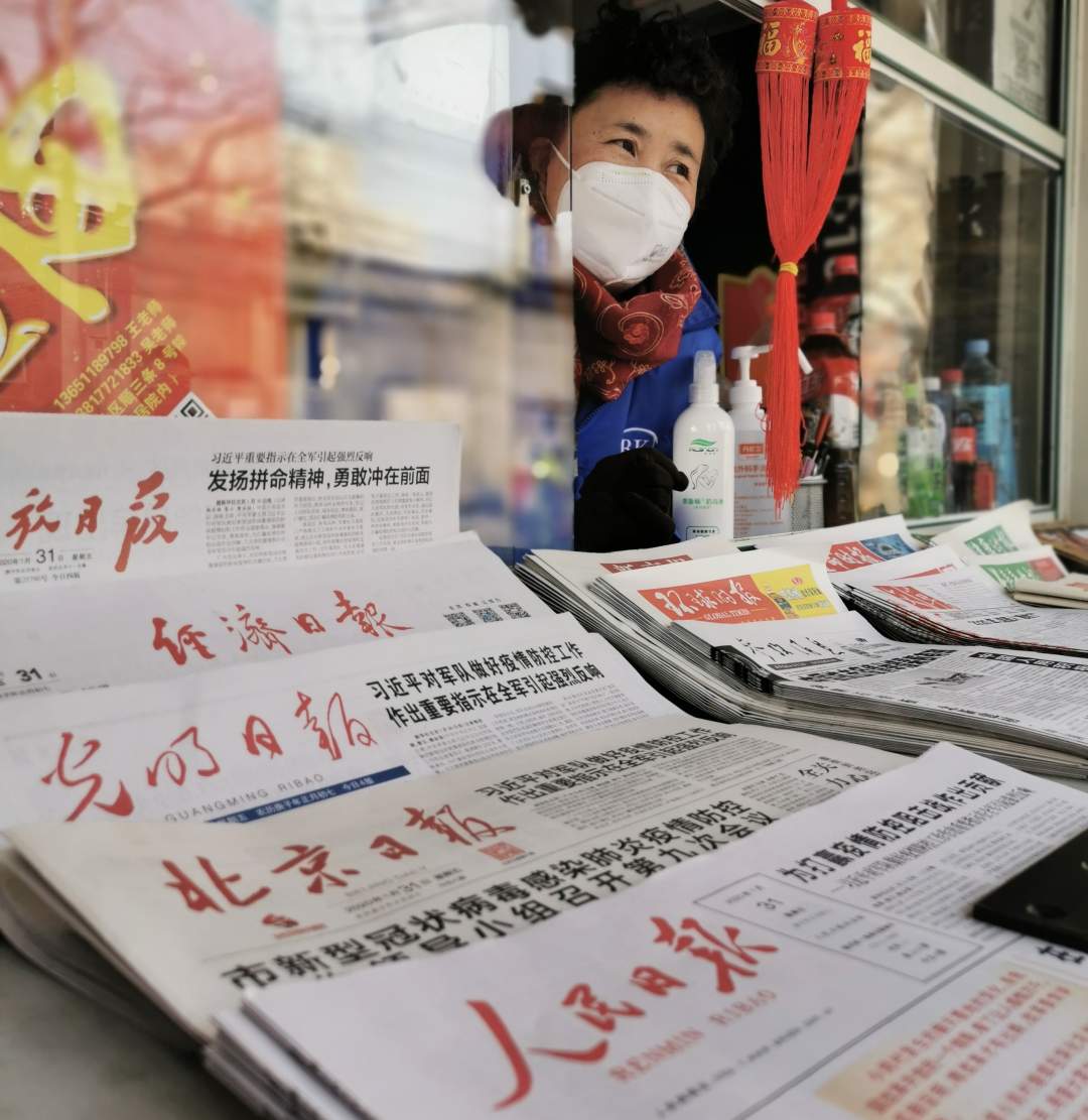 這個春節(jié)與往年不同,她開門第一件事兒,就是做好報刊亭的清潔消毒和自己的防護工作。她說,北京市報刊零售公司為我們配發(fā)了免洗消毒液和消毒劑,每天詢問健康情況,叮囑我們注意防護。9:30,一位老大姐過來買《北京日報》和《參考消息》;還有人來打聽晚報和疫情情況;9:40,一個快遞小哥兒習(xí)慣地把車停在報刊亭旁邊,掃碼4塊錢買了《北京日報》《參考消息》《環(huán)球時報》,直說好幾天沒看報了。今年從除夕到初七,這個報刊亭銷售報刊1599元,《人民日報》《北京日報》《參考消息》《北京晚報》累計銷售近500份。大姐這些天雖然總是戴著口罩,可一見到老客戶,眼角笑容立馬蕩漾出來,郵局配發(fā)的消毒液,她就擺在柜臺前面,經(jīng)常招呼顧客們消毒使用。問她怎么不關(guān)門休息幾天???她笑笑說,“周邊老人需要我啊,他們說報刊亭可不能再關(guān)了門了,每天就想著到報刊亭來溜達一圈呢”。