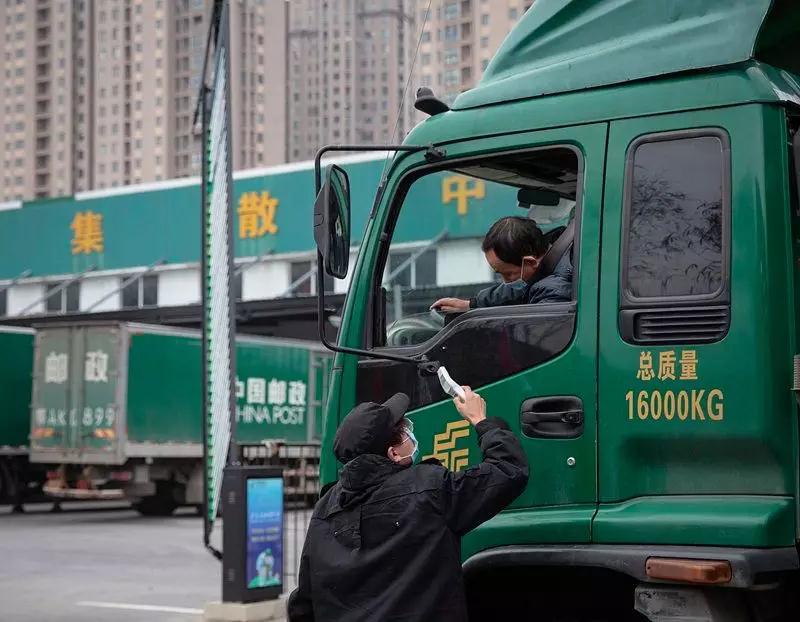 2月1日,武漢郵區(qū)中心局,工作人員為郵車司機(jī)測量體溫。