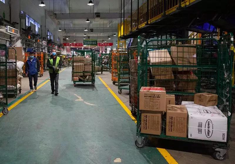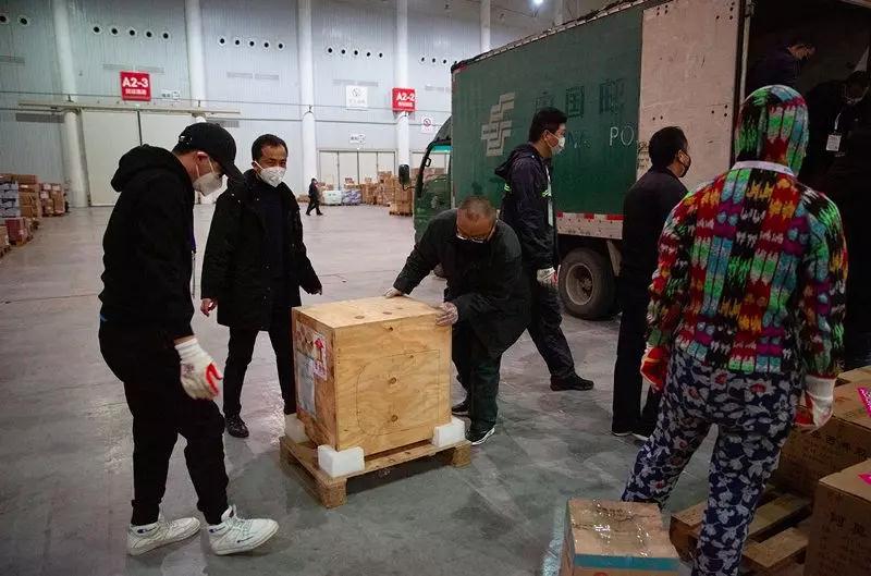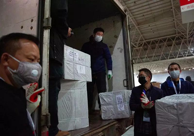 2月1日,武漢國際博覽中心,臨時(shí)被征用作倉庫的展廳內(nèi),現(xiàn)場志愿者和郵政工作人員從一輛中國郵政郵車上卸下一批來自杭州的醫(yī)療物資,其中包括PCR檢測系統(tǒng)等醫(yī)療設(shè)備。這里匯集了國內(nèi)外援助物資,來自武漢各個(gè)投遞點(diǎn)的郵政工作人員常駐現(xiàn)場,協(xié)助對物資進(jìn)行裝卸、分類和配送。