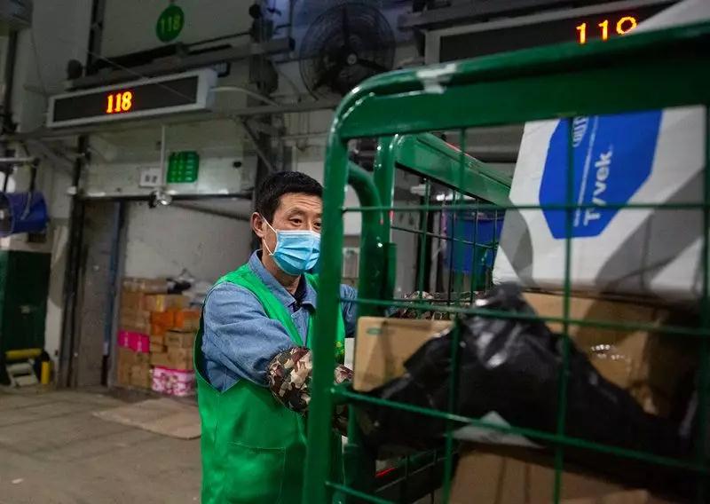 每天,綠色郵車不斷將物資匯集到位于武漢國際博覽中心的武漢市紅十字會臨時(shí)倉庫,來自多個(gè)郵政投遞點(diǎn)的工作人員幫助將物資卸車、分類。