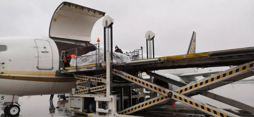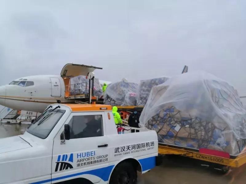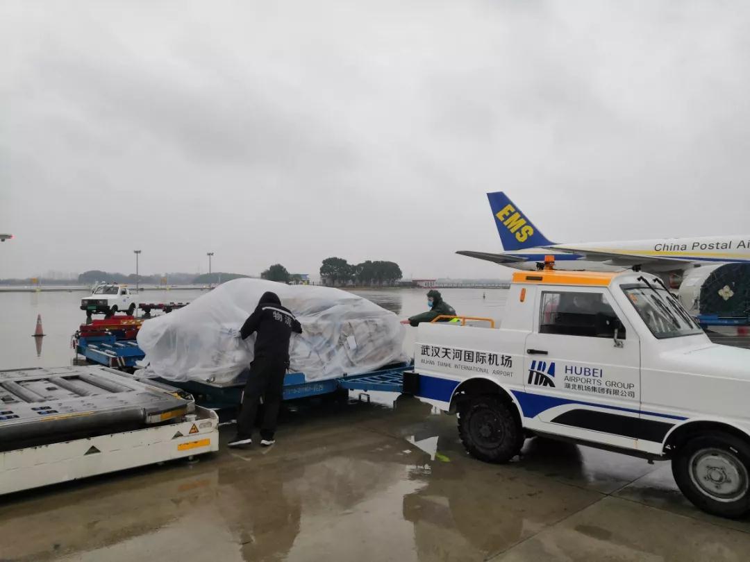 隨著飛機(jī)先后抵達(dá),武漢天河機(jī)場接卸作業(yè)迅速展開。由于下著小雨,郵航武漢辦事處人員在物資的機(jī)坪盤運中,緊急加蓋塑料布,防止物資被雨淋濕。通過緊張的作業(yè),郵航武漢辦事處均在半小時內(nèi)先后將兩架專機(jī)運抵物資移交陸側(cè)作業(yè),現(xiàn)該批物資正由武漢郵政迅速運往接收方。