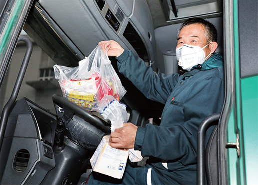 上海郵區(qū)中心局黨員駕駛員程勛江展示單位給他們準(zhǔn)備的食品,他全程要依靠這些“能量”將防疫援助物資運(yùn)達(dá)武漢?!踉S雨舟 攝影報(bào)道