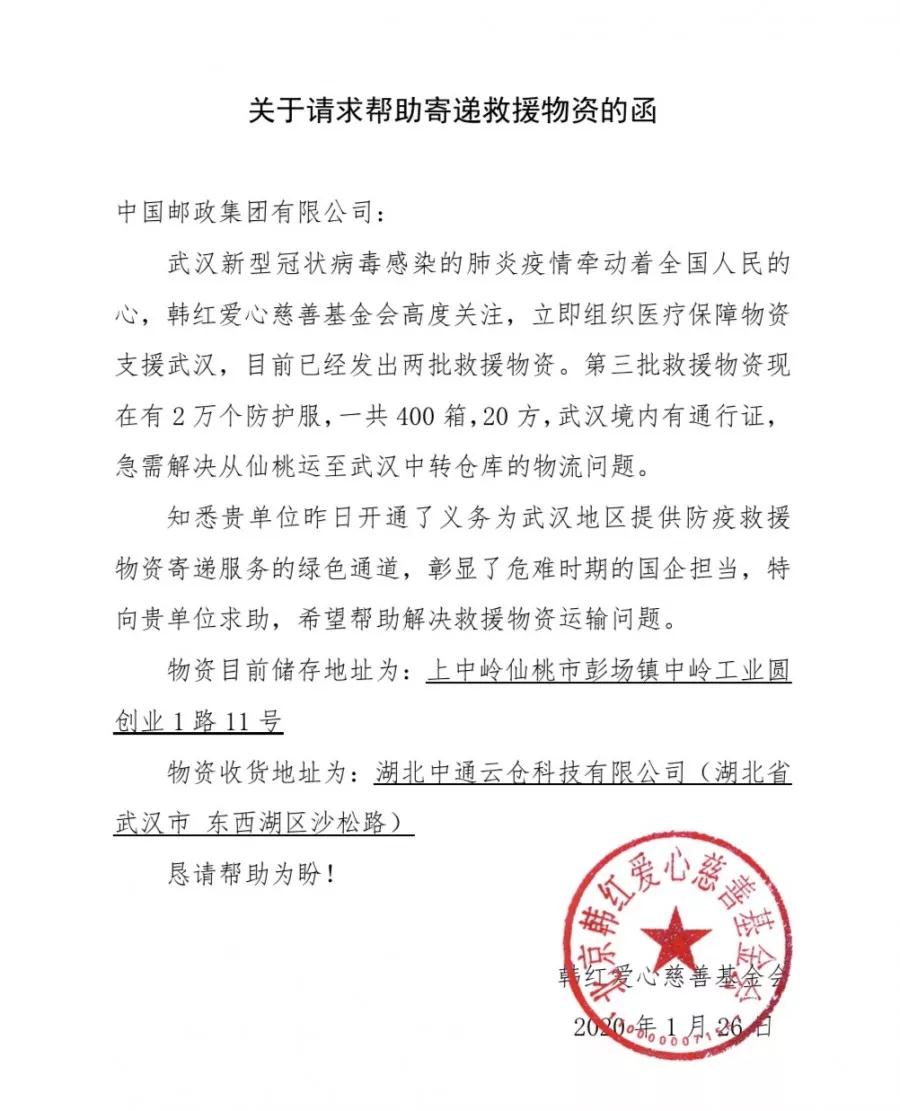 1月26日22時,湖北郵政收到由中國郵政集團(tuán)有限公司轉(zhuǎn)發(fā),由北京韓紅愛心慈善基金會寄出的《關(guān)于請求幫助寄遞救援物資的函》。