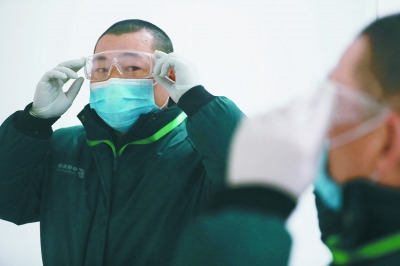 出發(fā)前,侯毅在衣冠鏡前整理著裝并檢查自己的個(gè)人防護(hù)裝備是否佩戴到位。