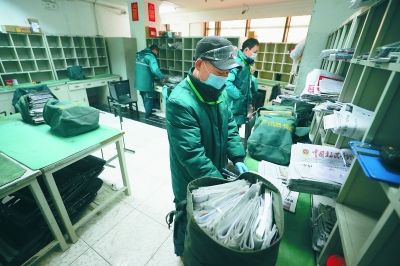 早上7點(diǎn),侯毅已到崗,按順序整理好要送的報(bào)紙、信件,一個(gè)大郵包被塞得滿滿的。出發(fā)前,他先給訂戶打電話,有人會(huì)到門口來(lái)取,有人會(huì)讓他放到門衛(wèi)處,還有人會(huì)讓他放到小區(qū)統(tǒng)一的暫存點(diǎn)。哪個(gè)用戶是什么習(xí)慣,他都熟稔于心。臨走,侯毅戴上塑膠手套、護(hù)目鏡,全身消毒,兜里隨時(shí)揣著一瓶消毒凝膠。