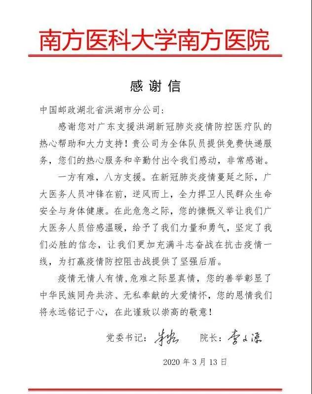 “感謝您對廣東支援洪湖新冠肺炎疫情防控醫(yī)療隊(duì)的熱心幫助和大力支持!貴公司為全體隊(duì)員提供免費(fèi)快遞服務(wù),您們的熱心服務(wù)和辛勤付出令我們感動(dòng),非常感謝。”3月13日,湖北省洪湖市郵政分公司收到了來自南方醫(yī)科大學(xué)南方醫(yī)院發(fā)來的感謝信,近日,他們?yōu)閺V東援鄂醫(yī)療隊(duì)隊(duì)員們免費(fèi)收寄了個(gè)人物資254件,讓醫(yī)療隊(duì)隊(duì)員們能夠輕松平安回家。