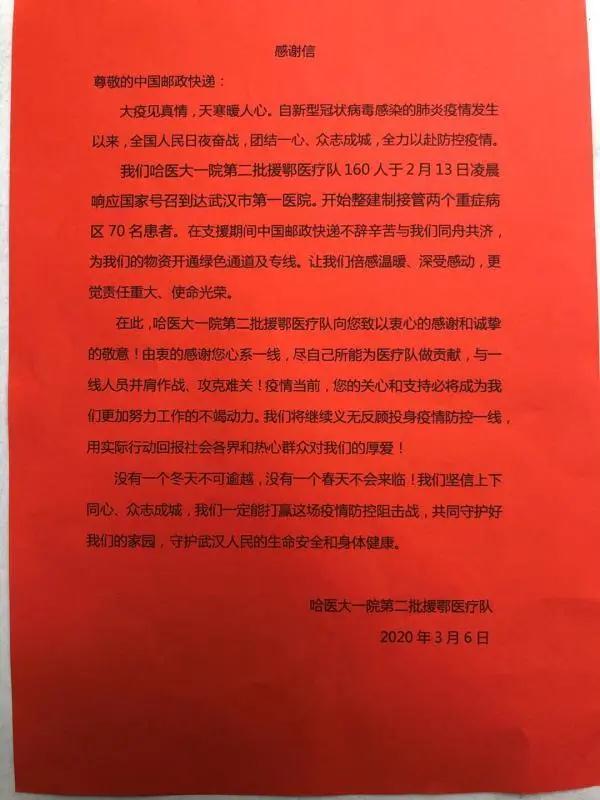3月6日,哈醫(yī)大一院第二批援鄂醫(yī)療隊(duì)為免費(fèi)寄遞個(gè)人物資服務(wù)向武漢郵政發(fā)來感謝信;3月11日,唐山、承德、張家口支援湖北醫(yī)療隊(duì)111名醫(yī)護(hù)人員通過“武漢交通”微信公眾號(hào)發(fā)表了“致敬郵政速遞人員”的文章,對武漢郵政的服務(wù)表示感謝。