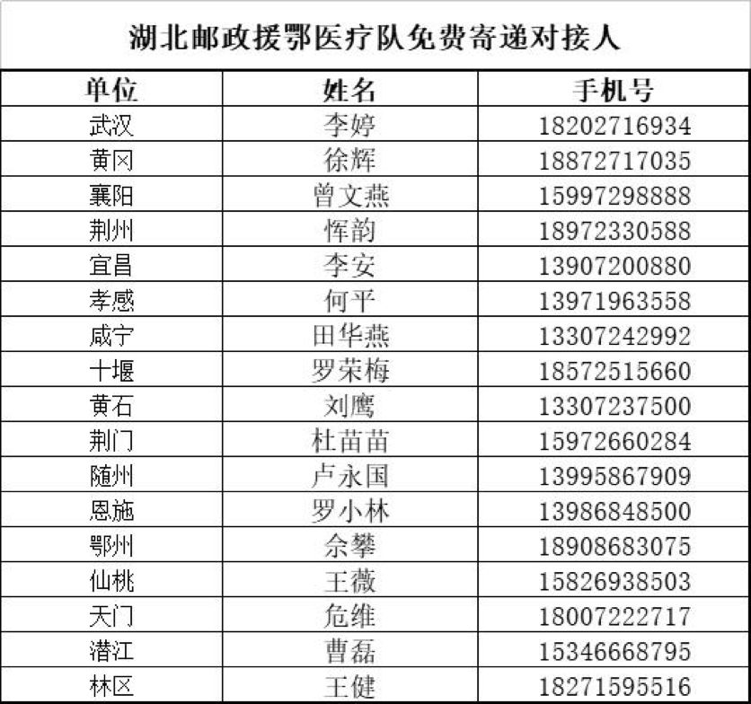 此次援鄂醫(yī)護(hù)人員個(gè)人物資免費(fèi)寄遞由黃岡市郵政分公司在湖北省率先開展,為山東和湖南援鄂醫(yī)療隊(duì)免費(fèi)收寄個(gè)人物資1200多件,受到了醫(yī)療隊(duì)員們的一致好評(píng)。而武漢作為此次全國疫情防控阻擊戰(zhàn)的重中之重,也是外省醫(yī)療隊(duì)援助的重點(diǎn),醫(yī)療隊(duì)員個(gè)人物品寄遞需求也最為迫切。武漢市郵政分公司第一時(shí)間對外發(fā)布公告,凡駐武漢市行政轄區(qū)內(nèi)的外省各級(jí)醫(yī)療服務(wù)隊(duì)員,均可通過聯(lián)系指定郵政工作人員的方式,由武漢市郵政分公司提供上門攬收服務(wù),免費(fèi)寄遞相關(guān)郵件。該分公司還成立了援鄂醫(yī)療隊(duì)個(gè)人物資免費(fèi)寄遞專班,積極與市防疫指揮部聯(lián)系,宣傳開展免費(fèi)寄遞服務(wù)。