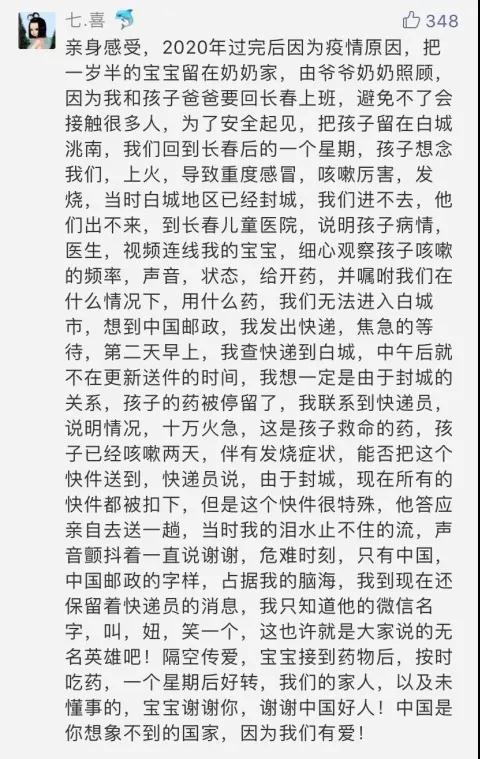 “感謝郵政,讓我被困在湖北那段日子里,還能收到來自外地小伙伴的防疫用品援助,余后很多年都會記得,在2020年初那個困難的日子里,祖國需要,郵政在!”