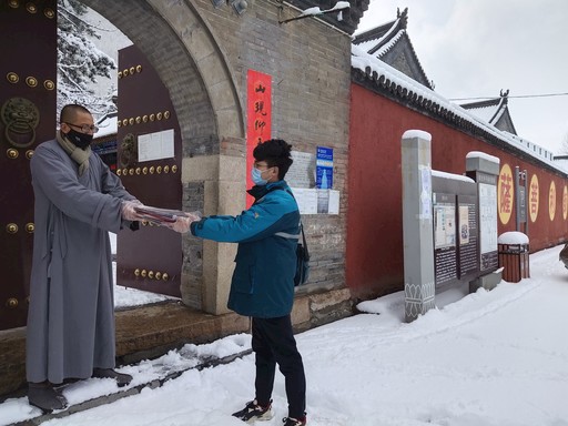 接下來(lái),高健喻到了第二個(gè)投遞點(diǎn)——善財(cái)洞。由于疫情防控期間寺院實(shí)行封閉管理,到了寺院門(mén)口后,小高撥通客堂師父釋仁恒的電話,告知郵件來(lái)了。很快,釋仁恒打開(kāi)厚重的寺門(mén)接過(guò)報(bào)紙說(shuō):“小高,這么大的雪你還過(guò)來(lái)了?每天看看你送來(lái)的報(bào)紙,了解天下大事,對(duì)我們也是一種很好的修行?!?/p>