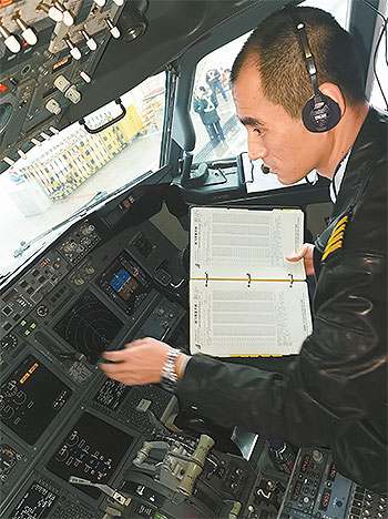 每次起飛前,王曉輝必做的事就是持手冊逐項對照檢查,確保各儀表及設(shè)備達到飛行要求。
