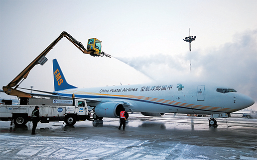 2 月14 日,北京首都機場降雪,王曉輝機長將執(zhí)飛郵政CF9121 航班奔赴湖北,圖為對飛機進行除冰作業(yè)。
