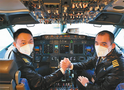1 月27 日,在首班防控疫情醫(yī)療物資專機起飛前,王曉輝和黃宏佳(左)緊握執(zhí)舵之手,發(fā)出“我是共產(chǎn)黨員,我堅守在防控疫情阻擊戰(zhàn)崗位”的心聲。