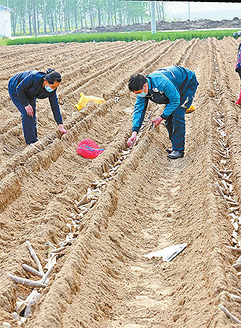 看到誰(shuí)家忙不過來,趙本增只要有空就會(huì)主動(dòng)上前搭把手。圖為春耕時(shí)節(jié),趙本增與支局的幾位同事幫助村民王大柱種植山藥。