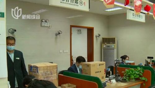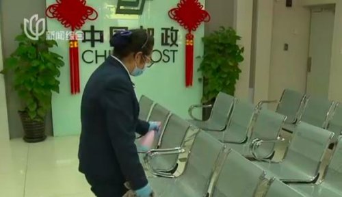 這家網(wǎng)點有銀行儲蓄業(yè)務(wù)和郵件寄遞服務(wù),為了防止病毒傳播,所有等待郵寄的包裹先在門外接受細(xì)致的消殺。
