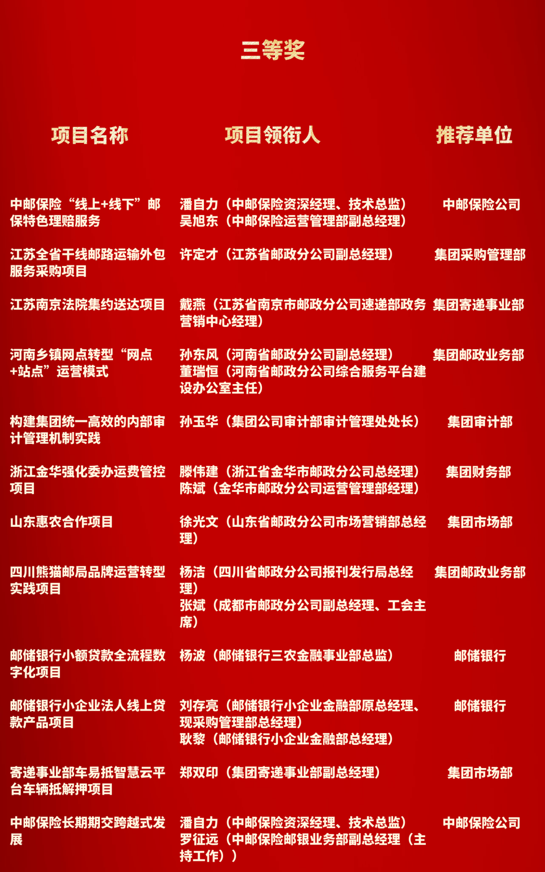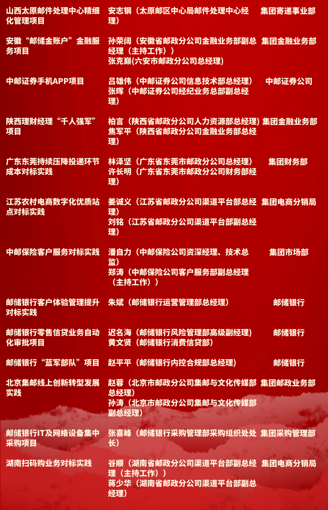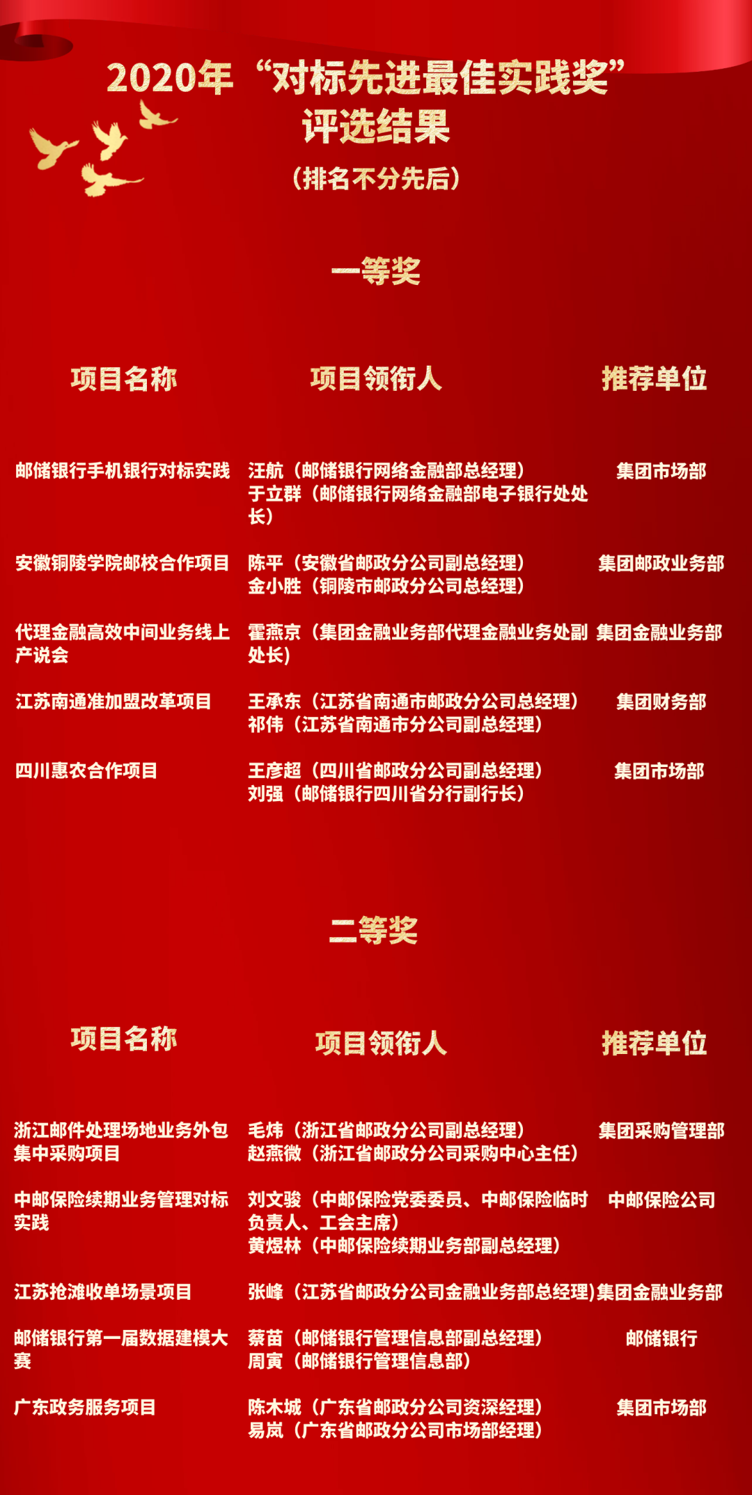 會議明確了2021年勞動競賽項目內(nèi)容和要求。2021年,集團公司勞動競賽將堅持問題導向、目標導向的競賽原則,緊密圍繞打造“六維共生”的新郵政發(fā)展格局,堅持以改革創(chuàng)新為動力,以推動中國郵政高質(zhì)量發(fā)展為主線,聚焦集團公司年度工作會議確定的發(fā)展目標、重點工作和重點項目,針對各項業(yè)務的發(fā)展重點、難點及薄弱環(huán)節(jié),共確定競賽項目17個,包括16個業(yè)務競賽項目和“對標先進最佳實踐獎”綜合性項目。