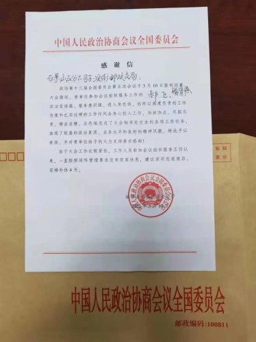 3月10日,中國(guó)人民政治協(xié)商會(huì)議全國(guó)委員會(huì)辦公廳向石景山區(qū)分公司寄來感謝信,對(duì)郵政兩會(huì)服務(wù)工作給予充分肯定和衷心感謝。信中表示,石景山區(qū)分公司郝飛、張宇燕同志在大會(huì)期間加班加點(diǎn),恪盡職守、熱情服務(wù),出色地完成大會(huì)秘書處交辦的各項(xiàng)工作任務(wù)。