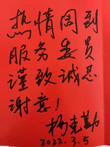 全國(guó)政協(xié)委員楊克勤寫下:熱情周到服務(wù)委員,謹(jǐn)致誠(chéng)懇謝意!