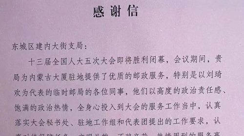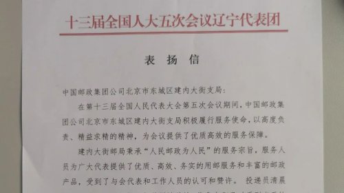 遼寧代表團(tuán)在感謝信中提到,“建內(nèi)大街支局秉承‘人民郵政為人民’的服務(wù)宗旨,為廣大代表提供了優(yōu)質(zhì)、高效、務(wù)實(shí)的用郵服務(wù)和豐富的郵政產(chǎn)品,受到了與會(huì)代表和工作人員的認(rèn)可和贊許,投遞員清晨就將當(dāng)天的會(huì)議用報(bào)及郵件送到駐地,保證了時(shí)限。在此向中國(guó)郵政致以誠(chéng)摯的感謝,并提出表揚(yáng)!”