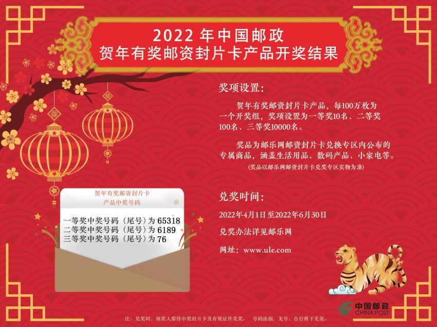 2022年賀年有獎(jiǎng)郵資封片卡中獎(jiǎng)號(hào)碼于3月18日產(chǎn)生?,F(xiàn)將中獎(jiǎng)信息通知如下: