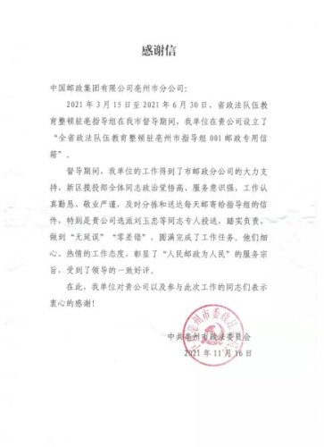 日前,亳州市分公司收到來(lái)自中共亳州市政法委員會(huì)的一封感謝信,感謝亳州市分公司新區(qū)攬投部圓滿完成專用信箱的投遞工作,對(duì)郵政服務(wù)表示高度贊賞。