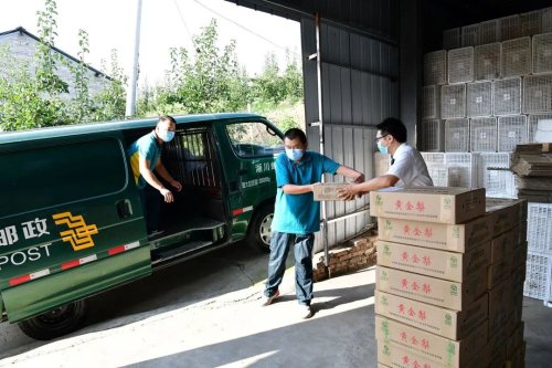 “大家都辛苦了,先歇歇,吃個果子再搬也不遲?!辈贿h處,身著“郵政綠”的工作人員正揮汗如雨,幫果農把金燦燦的富硒梨裝箱上車。