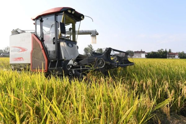 大型聯(lián)合收割機在稻田里收割