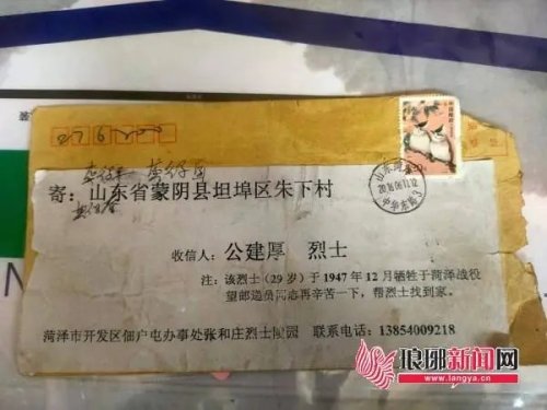 那是2016年6月13日,王德建在對照清單進行勾挑核對信件時,發(fā)現(xiàn)了一封特別的信件。信封上印著“尋找烈士”四個鮮紅大字,寄信人是一位幫助烈士尋親的志愿者——菏澤市經(jīng)濟開發(fā)區(qū)佃戶屯街道辦事處張和莊社區(qū)黨支部書記張景憲,收件地址是“蒙陰縣坦埠區(qū)朱下村”,收件人是“公建厚烈士”,下邊還標(biāo)注著一行小字:該烈士(29歲)于1947年12月犧牲于菏澤戰(zhàn)役,望郵遞員同志再辛苦一下,幫烈士找到家。