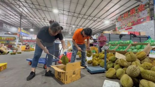 采訪完徐鈺鋒,記者跟隨潘新杰來到離郵政倉不遠(yuǎn)的水果市場,為當(dāng)日線上訂單客戶挑選榴蓮?!傲裆徱ㄟ^敲打來分辨生熟程度。偏生,就適合發(fā)較遠(yuǎn)的地區(qū);偏熟,則適合發(fā)往近的地方,這樣可以保證客戶收到水果時(shí)生熟正好。如果天氣熱,還要加冰來保證果肉新鮮。芒果如果是發(fā)到東北,我們會加裝保溫袋來避免水果凍傷?!闭f起不同水果的“發(fā)運(yùn)經(jīng)”,潘新杰滔滔不絕。