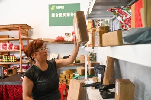 快遞抵達(dá)后,超市老板商興菊按照手機(jī)尾號(hào)把快遞分揀在貨架上。這家超市每天營(yíng)業(yè)時(shí)間從早上六點(diǎn)至晚上十一點(diǎn),村民在外干完農(nóng)活可以隨時(shí)到超市免費(fèi)取快遞。