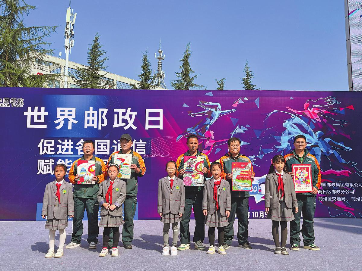 陜西省商洛市郵政分公司舉辦世界郵政日宣傳暨“童心同行 郵政相伴為美好生活加‘郵’”活動(dòng),來自商州區(qū)第六小學(xué)的5位小朋友現(xiàn)場為郵政快遞員送上了精美的手繪作品。 □張瀟 攝