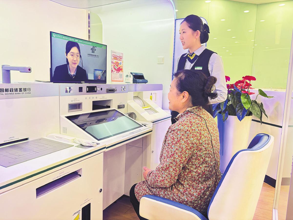客戶于阿姨在廳堂服務人員王亞琳的引導下使用云柜辦理業(yè)務。