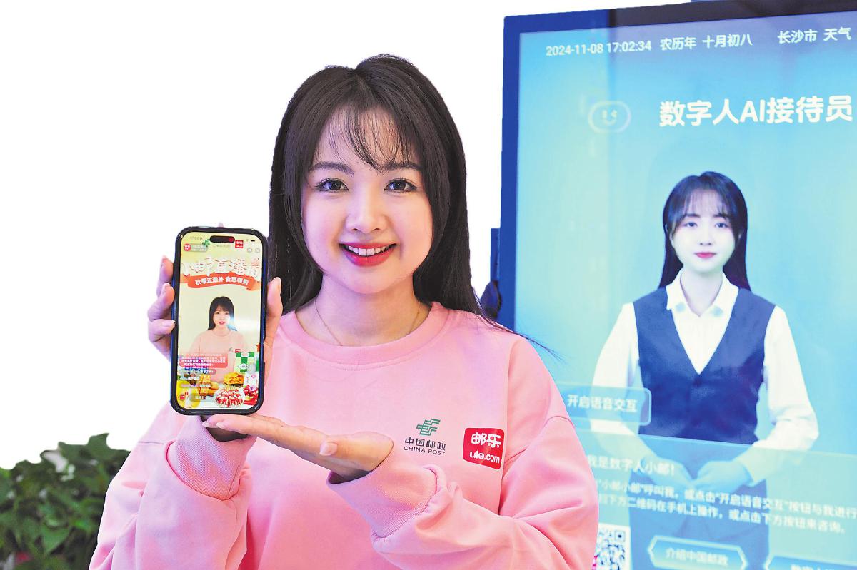 11月7日,在湖南長沙的郵樂直播產(chǎn)業(yè)基地一層展示大廳,面對本報采訪組的提問,接待大屏里的數(shù)字人“小郵”應(yīng)答自如。墻上的廣告屏里,播放著“小郵”進(jìn)行特色農(nóng)產(chǎn)品直播的畫面。一旁,這個“小郵”的原型——基地金牌主播劉思穎正一臉微笑地看著我們。