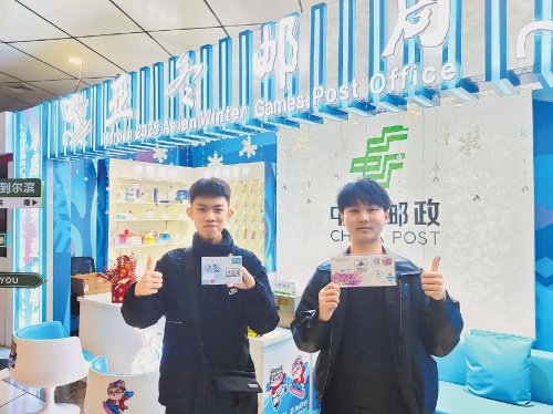 “我剛剛選了一套單板滑雪的紀念郵票和亞冬會倒計時50天紀念郵資封。因為很榮幸被選為亞冬會志愿者,我覺得應(yīng)該留下一些值得紀念的東西,正好看到了亞冬會郵局里的產(chǎn)品特別精美,也特別契合這次亞冬會的主題,很有意義?!备咧猩驹刚邊挝牟╅_心地說。而他的同學(xué)在看到他手中的紀念郵品時也很喜歡,在呂文博的指引下來到郵局購買了幾枚明信片。郵政工作人員得知他是為了收藏紀念,特意為他選了精美的郵戳加蓋在明信片上。