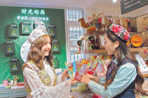 走進(jìn)大巴扎主題郵局,琳瑯滿目的文創(chuàng)產(chǎn)品吸引了眾多游客駐足觀賞、購買。整面墻的新疆風(fēng)光明信片和醒目的“時(shí)光郵局”4個字最先抓住游客的眼球。來自全國各地的年輕人將對未來的期待、對生活的感悟、對親人的思念,寫在信紙上裝入信封,投入“時(shí)光郵局”的信箱,寄給未來的自己,充滿儀式感。